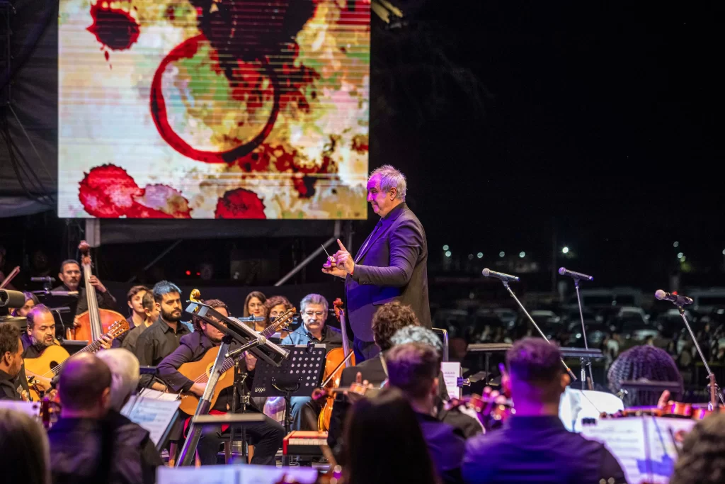 100 músicos en escena y ante más de 15.000 personas que colmaron el tradicional predio del Aeropuerto de Mendoza, la banda liderada por Germán Daffunchio ofreció una versión inédita y sofisticada de su repertorio, junto a la Orquesta Filarmónica de Mendoza bajo la dirección del maestro Popi Spatocco. ¿El dato de color? el escenario flotó sobre 3 hectáreas de Malbec.